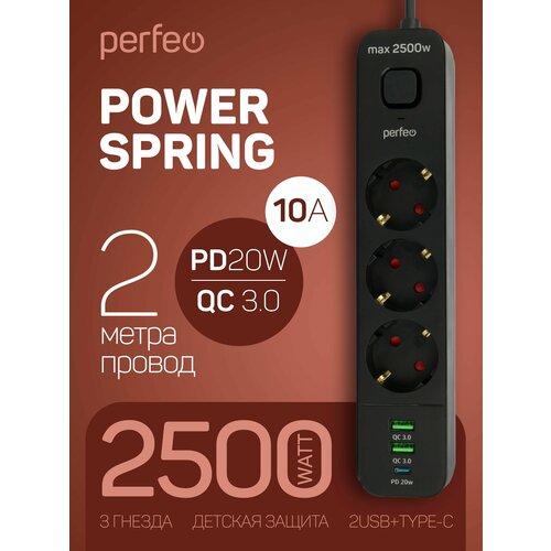 Сетевой фильтр POWER SPRING 2500W 2м 3роз, 2USB +1TYPE-C, черный