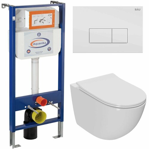 Комплект BAU 6 в 1: инсталляция BAU Aquanika, унитаз безободковый Bau Dream PRO-2, сиденье микролифт, прямоугольная белая клавиша