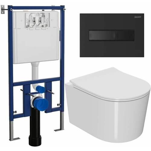 Комплект 6 в 1: инсталляция Loranto с прямоугольной черной матовой клавишей, унитаз безободковый Bau Hotel PRO сиденье микролифт, крепления