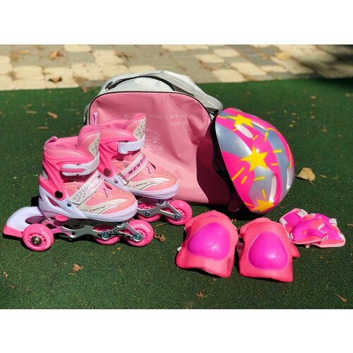 Розовые раздвижные роликовые коньки, шлем, защита коленей, локтей, кистей, сумка, размер (30-33)