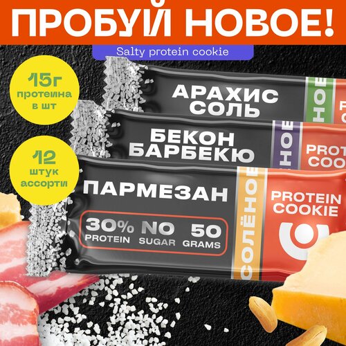 Первое солёное протеиновое печенье 30% белка PUREPROTEIN Мультибокс : Арахис, Бекон, Пармезан 12*50г