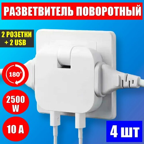 Мощный поворотный тройник для розеток с двумя USB 2500W-10A, разветвитель для розеток - 4шт.