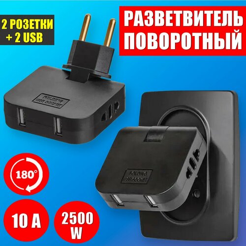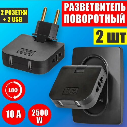 Мощный поворотный тройник для розеток с двумя USB 2500W-10A, разветвитель для розеток - 2шт.
