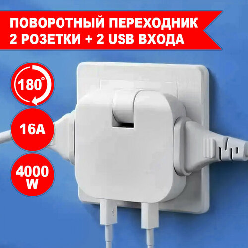 Мощный поворотный тройник для розетки с USB 4000W-16А. Вилка-разветвитель-переходник: 2 вилки и 2 USB. Плоский, сетевой адаптер для всех типов вилок: A, C, F. Зарядка для телефона.