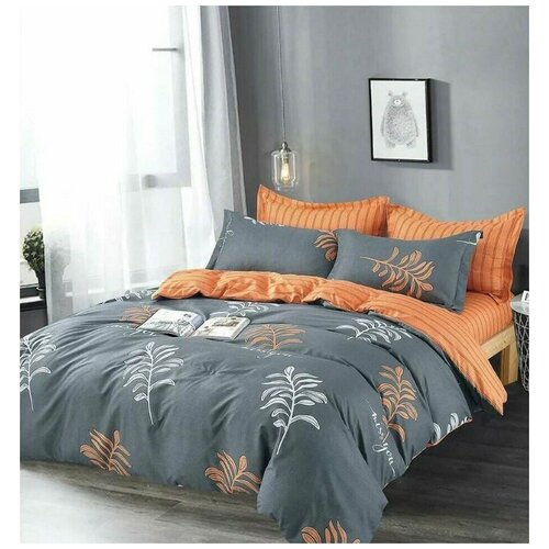 Комплект постельного белья 1.5 спальный, сатин, 2 наволочки 70х70, пододеяльник на молнии, простыня на резинке по углам, серый/рыжий