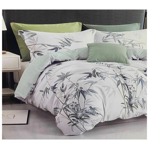 Комплект постельного белья для детей и взрослых, для мальчиков и девочек"Aimee" 2,0-х спальный-сатин, белый зеленый, бамбук, растения