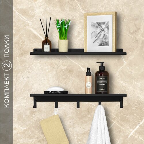 Полка с крючками Alvente в ванную комнату для полотенец двухъярусная открытая настенная навесная металлическая на стену черная лофт 50 см 2 шт