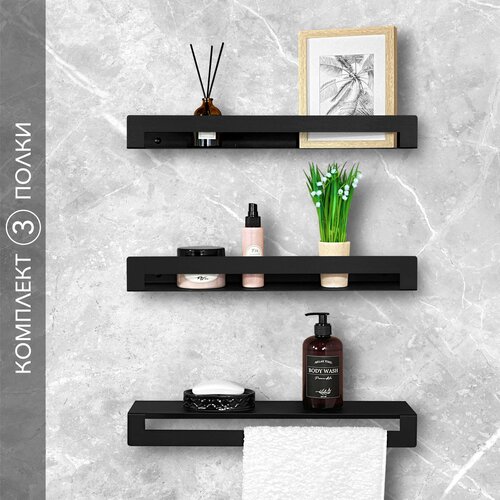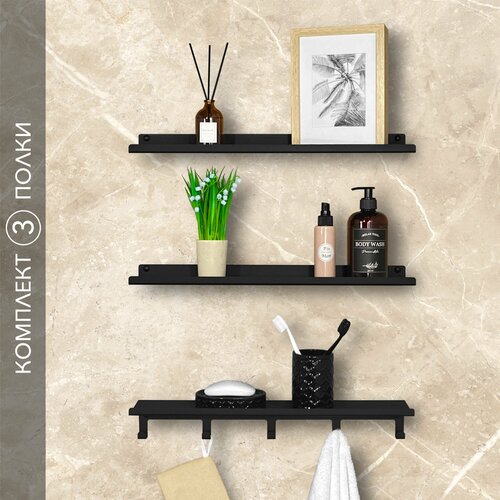 Полка с крючками Alvente в ванную комнату для полотенец трехъярусная открытая настенная навесная металлическая на стену черная лофт 50 см 3 шт