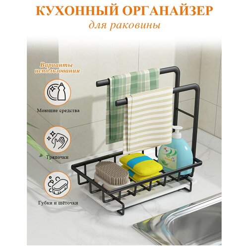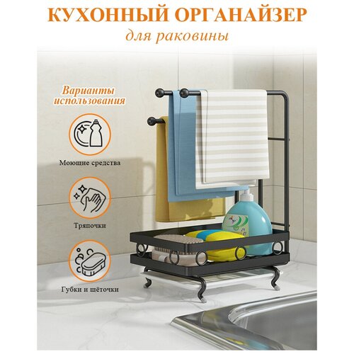 Кухонный органайзер на мойку / кухонный держатель для губки, тряпочек, моющих средств AVIK (корзина + два держателя)
