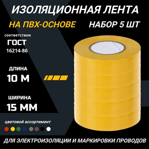 Изолента желтая ПВХ 15 мм 10 метров набор ленты изоляционной 5 роликов