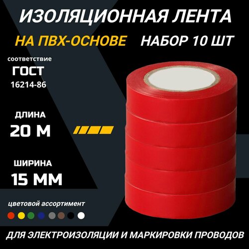 Изолента красная ПВХ 15 мм 20 метров набор ленты изоляционной 10 роликов
