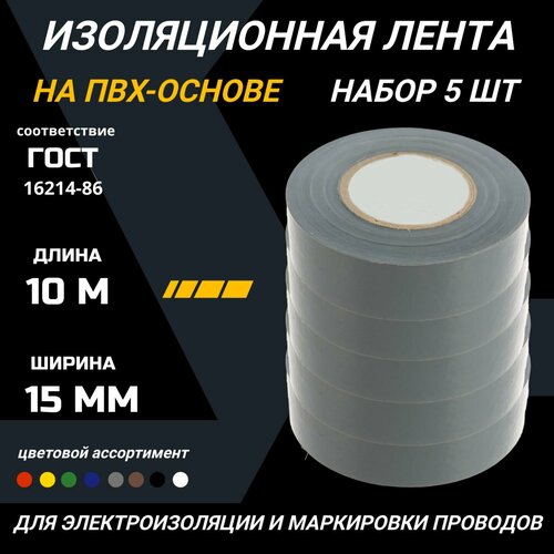 Изолента серая ПВХ 15 мм 10 метров набор ленты изоляционной 5 роликов