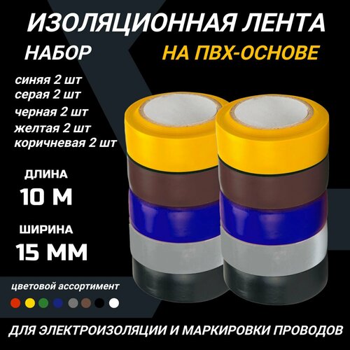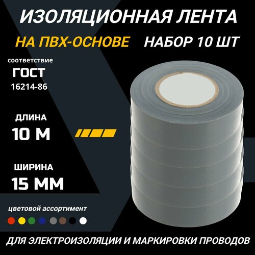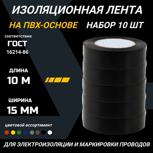 Изолента цветная ПВХ 15 мм 10 метров набор ленты изоляционной 10 роликов