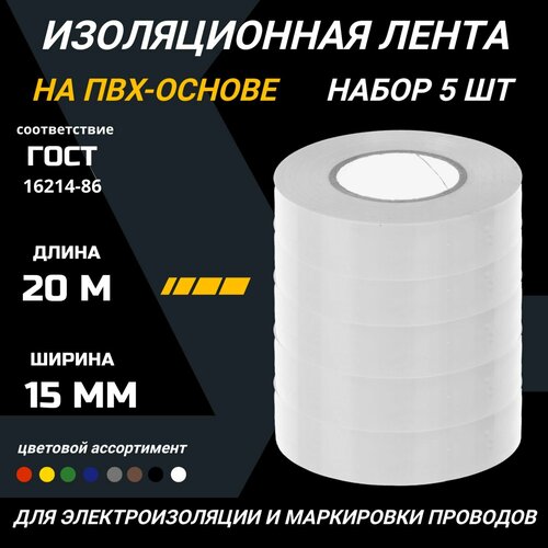 Изолента белая ПВХ 15 мм 20 метров набор ленты изоляционной 5 роликов