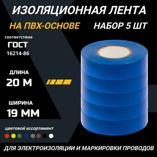 Изолента синяя ПВХ 19 мм 20 метров набор ленты изоляционной 5 роликов
