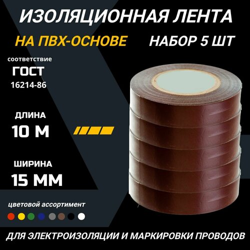 Изолента коричневая ПВХ 15 мм 10 метров набор ленты изоляционной 5 роликов