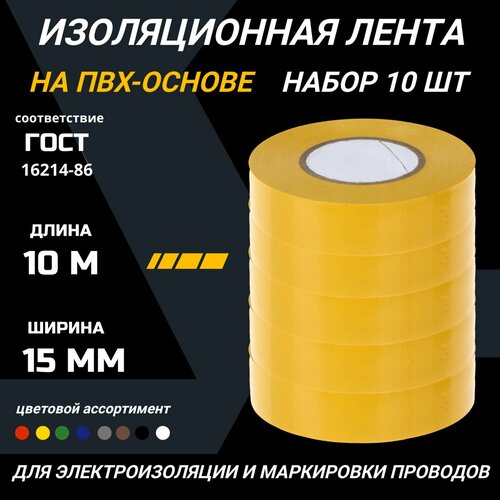 Изолента желтая ПВХ 15 мм 10 метров набор ленты изоляционной 10 роликов