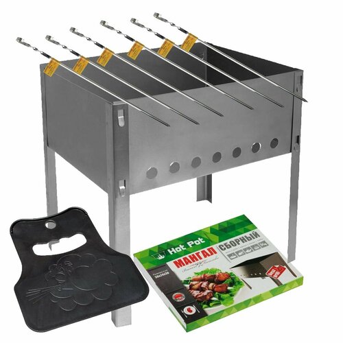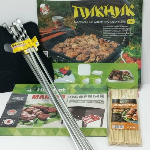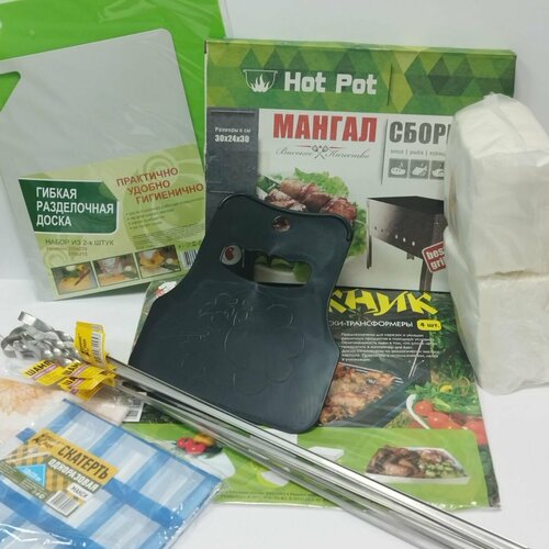 Мангал складной походный 30х24х30см, опахало, шампуры угловые 55см 6шт, разделочные доски-трансформеры 4шт, гибкие доски 2шт, скатерть одноразовая 120х220см 2шт, салфетки бумажные 100шт 2 упаковки
