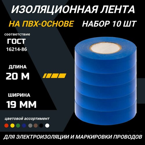 Изолента синяя ПВХ 19 мм 20 метров набор ленты изоляционной 10 роликов