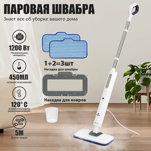 Паровая швабра DARIS белая, 3 насадки в комплекте