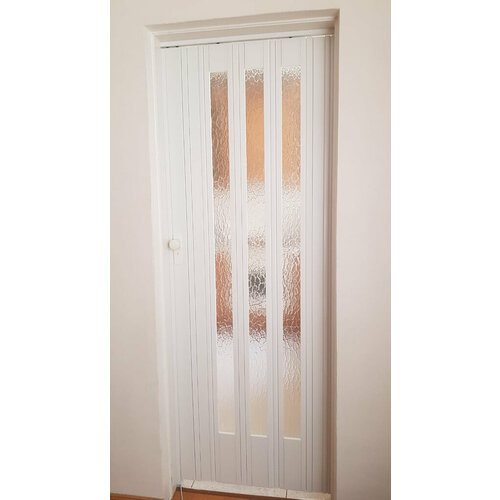 Дверь гармошка 2030х725мм с замком и колесиками Star остекленная белая полуматовая