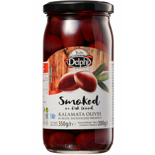 Маслины Delphi, Kalamata, копчёные на дубовых опилках, с косточкой, в рассоле, ст/б, 350 г