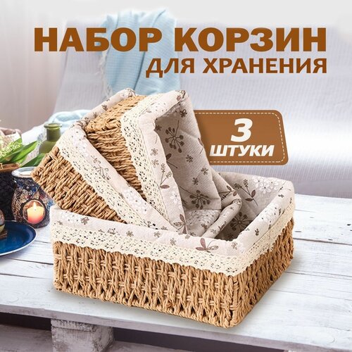 Набор плетёных корзин из 3-х штук для хранения в светло-коричневом цвете