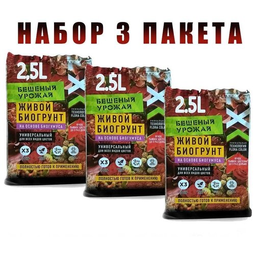 Грунт Универсальный для всех видов цветов. Бешеный Урожай 2.5л. Набор три пакета