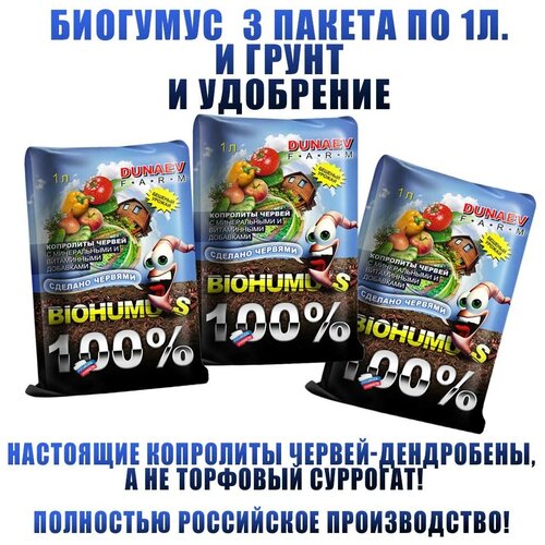 Биогумус плодородный грунт для домашних и садовых растений набор 3 пакета по 1л.