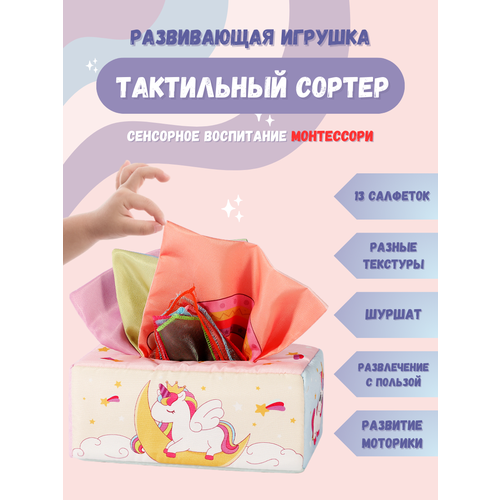 Тактильный сортер Монтессори, развивающая мягкая игрушка салфетница для детей Единорог