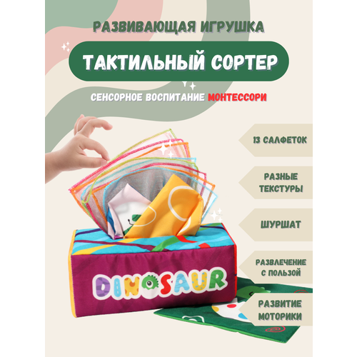 Тактильный сортер Монтессори, развивающая мягкая игрушка салфетница для детей Динозавр
