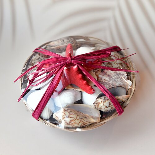Комплект ракушек FANTASY, комплектация Raffia Ribbon I, в корзинке 20 см, с красной пальмовой веревкой