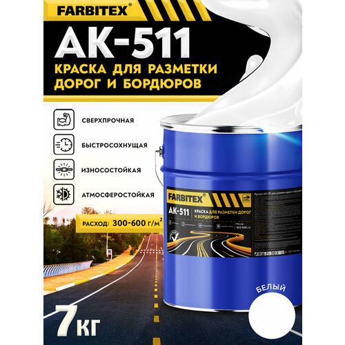 Краска Farbitex АК-511, белая, для разметки дорог, бордюров, 7 кг