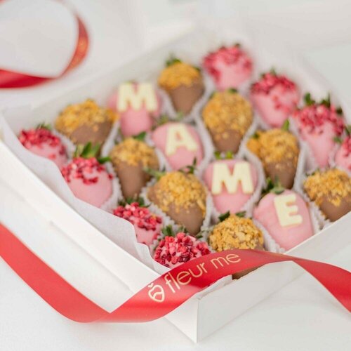 Набор спелой клубники в молочном и розовом шоколаде со словом «маме», вафельной крошкой и сушеной малиной «Мераль» на 20 ягод