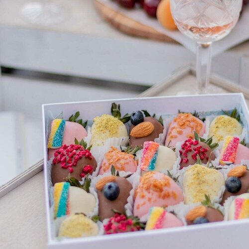 Набор клубники в шоколаде с миндалём, фисташкой, мармеладом, вафельной крошкой, сублимированной малиной и ягодами голубики коробка «Порто» на 20 ягод