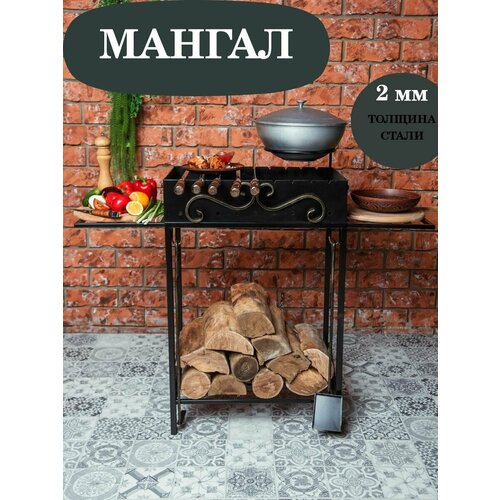 Мангал-гриль с крышкой, деревянными полками, дровницей для дачи и дома, сталь 4 мм