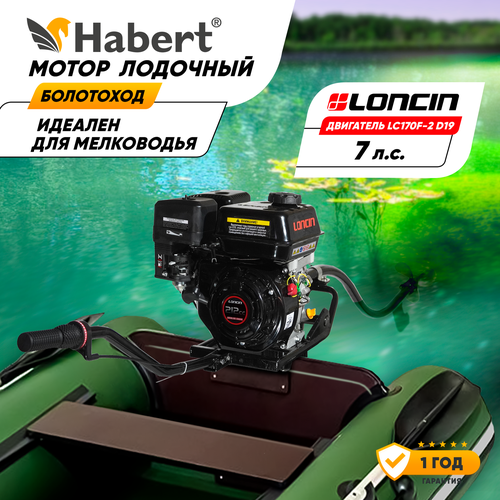 Мотор лодочный болотоход Habert (двигатель Loncin LC170F-2 D19), 7 л. с, 212 куб. см, вал 19 мм, ручной старт, 4-х тактный