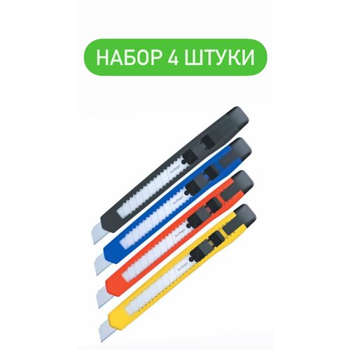 Канцелярский нож, строительный ножик, универсальный, с фиксатором, 9мм, разноцветные, набор 4 штуки