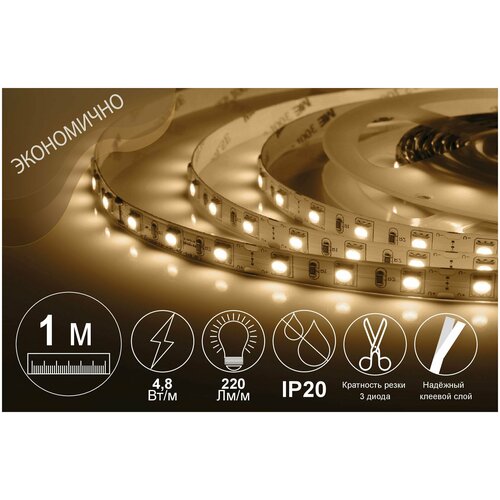 Светодиодная лента. Комплект LED подсветки. 1 метр. 12В, 4.8 Вт/м, SMD 3528, 60 диодов/м, IP20, 7 Лм/чип, тёплый белый