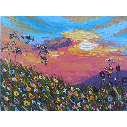 Картина маслом на холсте "Цветы на закате " 20*15/ручная работа