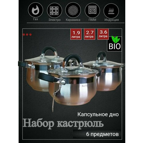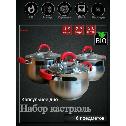 Набор кастрюль Восток стиль с капсульным дном, Сталь, Металл, 1,9 л, 2,7 л, 3,6 л