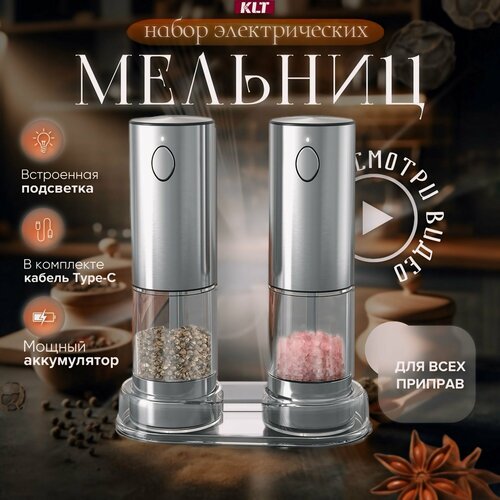 Набор Мельниц для специй KLT электрический с USB Type-C, KYMQ-32A-H-BS для соли, перца и других специй