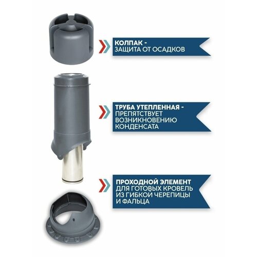Вентиляционный выход (комплект) 125 мм h-500 утеплённый Krovent с грибком и проходным элементом для мягкой и фальцевой кровли, (Ral 8017)