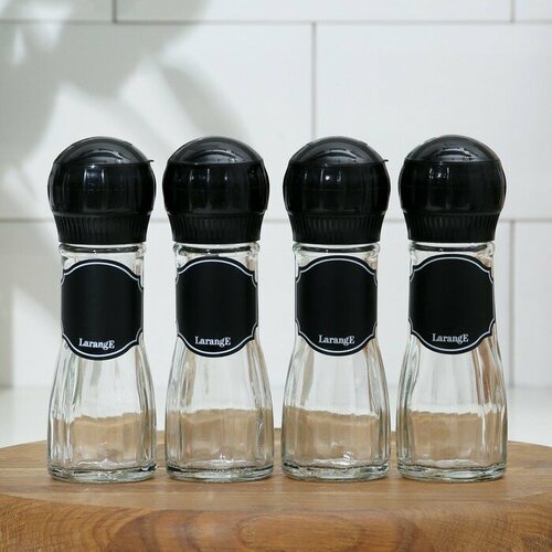 Набор мельниц для специй «Меловой дизайн», стеклянный, 75 мл, 4 шт, с мелком для маркировки, цвет крышек черный