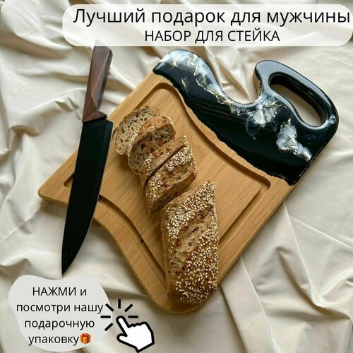 Подарочный набор для мужчины LONET в комплекте доска из дуба и нож для стейка, оригинальный подарок мужчине, начальнику, шефу в черном цвете