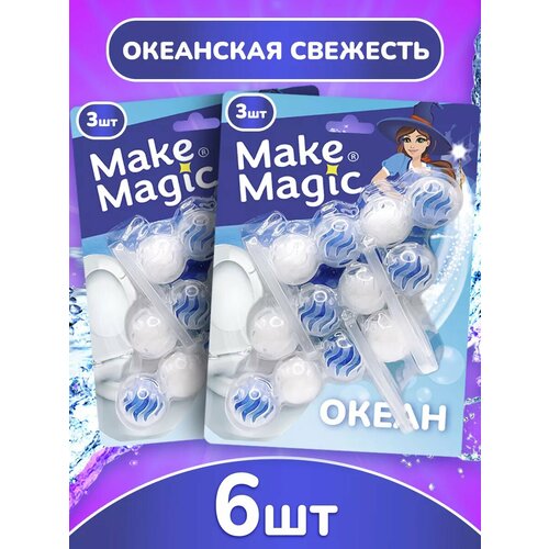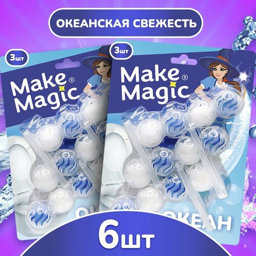 Средство для чистки унитаза Make magic океан, таблетки (шарики), 6 сменных блоков, освежитель подвесной в туалет от налета, 2 пачки по 3 блока