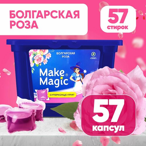 Капсулы для стирки цветного белья гелевые Make magic, универсальный жидкий стиральный порошок, гель в капсулах для всех типов тканей, в автоматических машинах, аромат болгарской розы 57 штук
