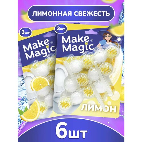 Средство для чистки унитаза Make magic лимон, таблетки (шарики), 6 сменных блоков, освежитель подвесной в туалет от налета, 2 пачки по 3 блока