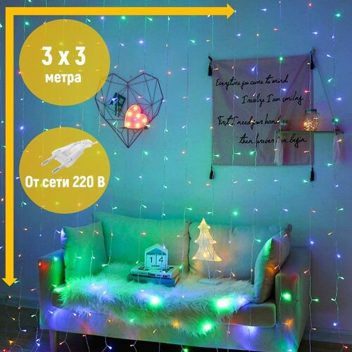 Светодиодная цветная RGB гирлянда / штора / 3 на 3 метра / питание От сети 220В