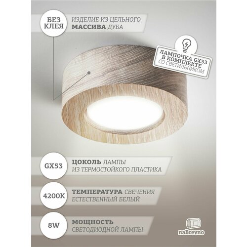 NaBrevno. Точечный накладной светильник GX53 8W 4200K, D100*42 мм, , белый дуб.
